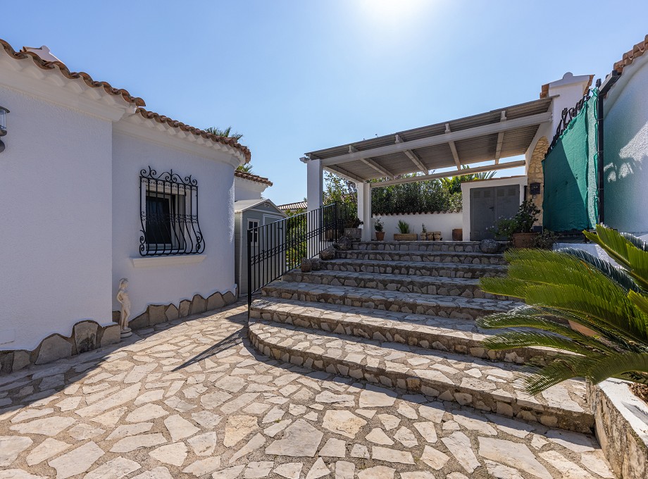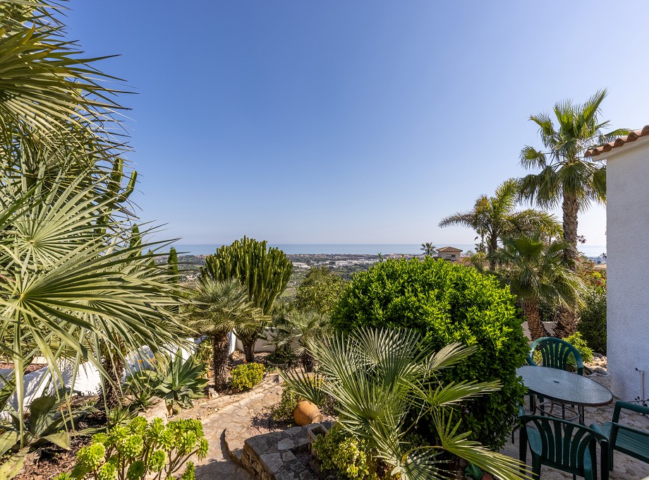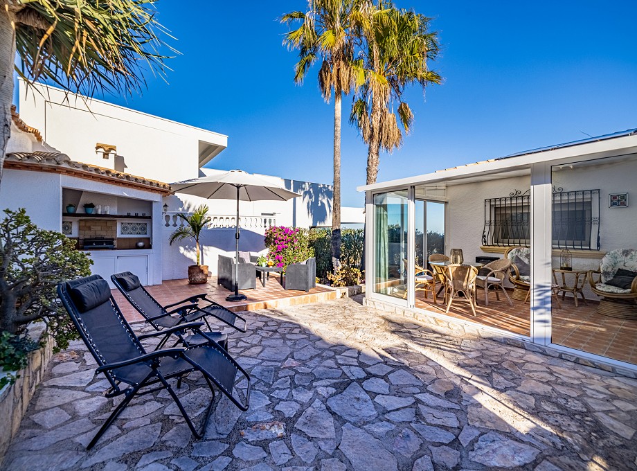In Denia, the gate to the Costa Blanca, we present Villa Brima. This Villa is located in the Marquesa 6 district with a wonderful view of the Mediterranean Sea and the coastline. We offer a detached house with a spacious living area of about approx. 110 sqm on a plot of 850 sqm, 2 double bedrooms, 2 bathrooms, spacious living room, dining room and a modern kitchen with a spectacular sea view. At the entrance you have a carport with an electric gate. With a few steps you reach a wind-protected terrace with wintersun at the level of the ground floor of the house. In a corner of the winter terrace you can find a small outdoor kitchen with gas grill plate and sink. In front of the house entrance is a spacious wintergarden. A small hallway takes you directly into the spacious living room with 1 comfortable sofa and 2 relaxation chairs, a modern TV – with SAT TV and Spanish programs and a fireplace