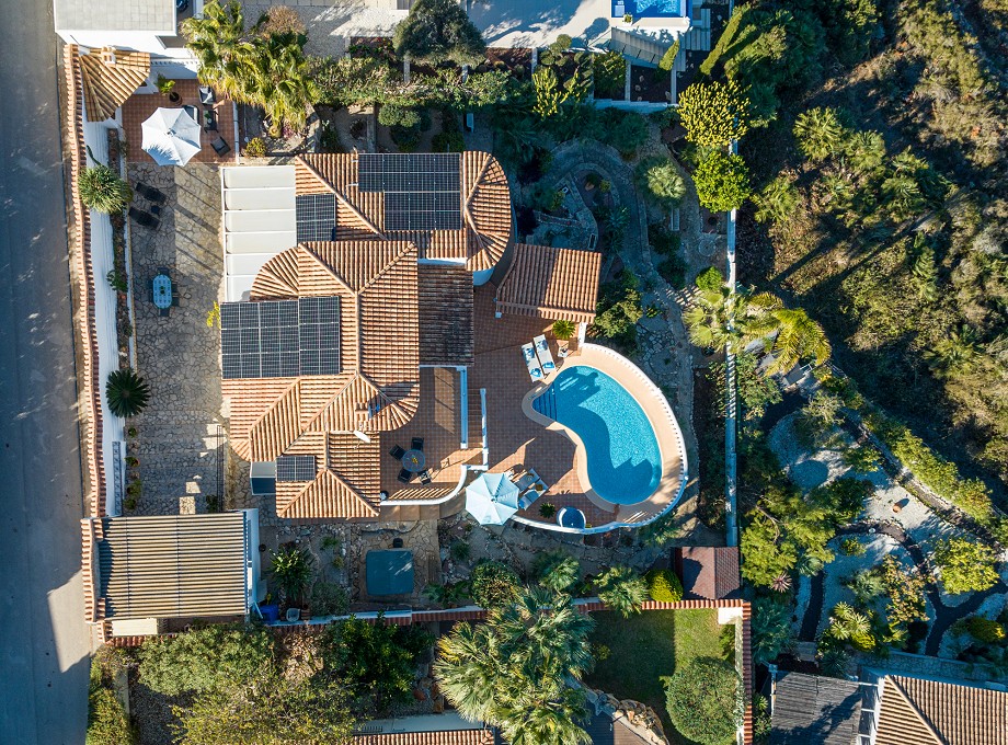 The glazed dining room is in front of the living room. Both bedrooms with fitted wardrobes, one with a double bed 160 x 200 cm, the second bedroom with 2 beds of 90 x 190 cm. In the double room there is an additional TV – SAT TV and Spanish programs. Right next to each bedroom is a bathroom with a walk-in shower, toilet, double sink, one with a urinal and one with a bidet. In February 2022 a new modern kitchen was installed with offers you all the luxury and comfort. Glass ceramic hob with extractor hood, oven, dishwasher and fridge-freezer combination, central kitchen block with 2 seating options and a wine cooler. The kitchen has direct access to a terrace in front with sea views. With a few steps from ground floor you reach pool terrace with a kidney-shaped pool measuring 8.00 x 4.00 m. On this hidden from you terrace, you can find a small pool bar, as well as a cold/warm outdoor shower and a separate toilet. Below the pool level there is a garden with Mediterranean plants and various seating options.