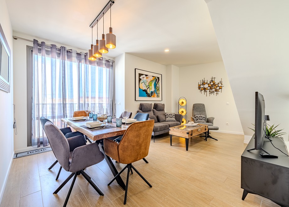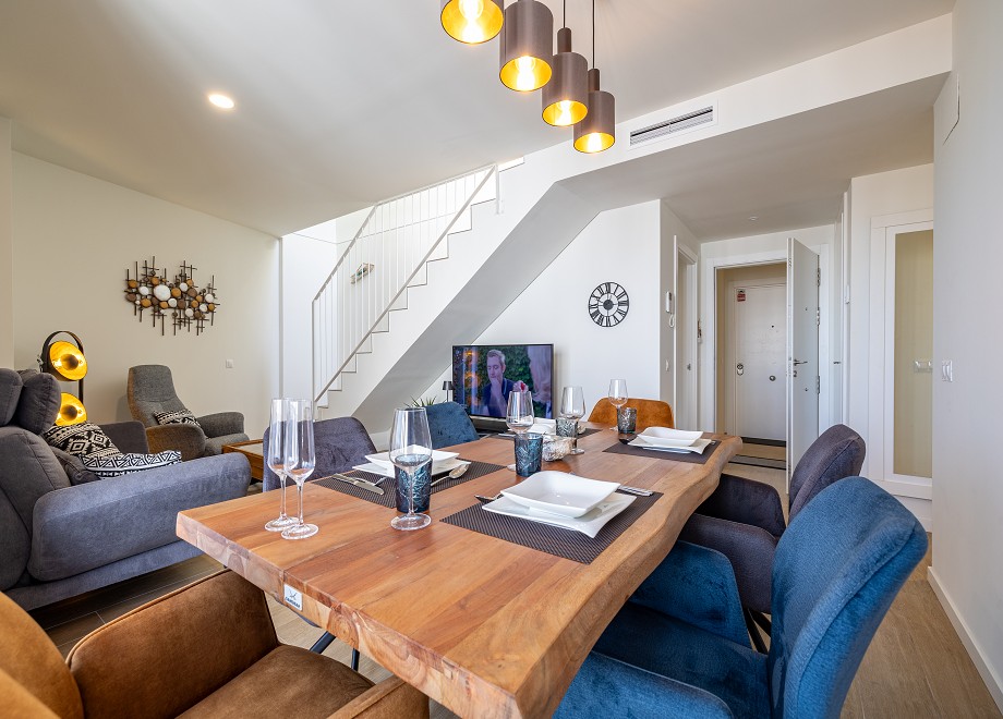 Straight ahead you reach the living and dining area. This is very modernly furnished with a large dining table, a comfortable 2-seater sofa and an armchair. There are 2 TVs with satellite TV, in the living room and in one of the double bedrooms.