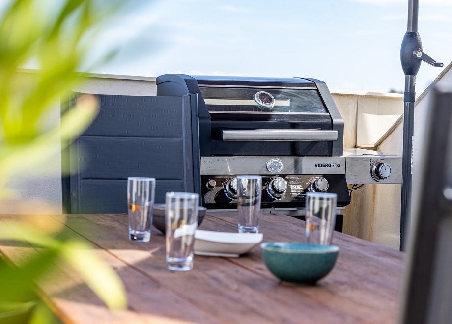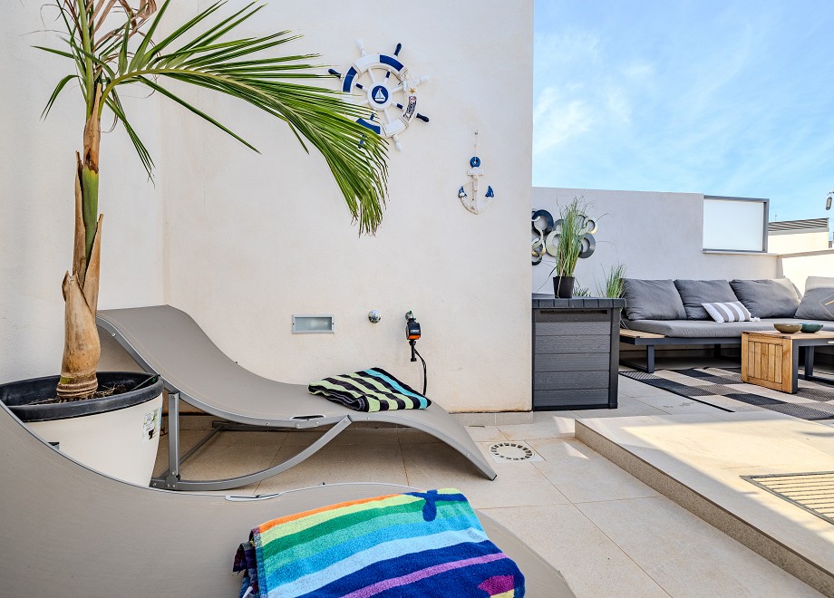 The roof terrace can be reached via a staircase (20 steps) from the living room. In addition to a comfortable patio sofa, a large dining table, a grill and 2 sun loungers, there is also a modern jacuzzi for up to 4 people. 2 parasols offer you shade.
