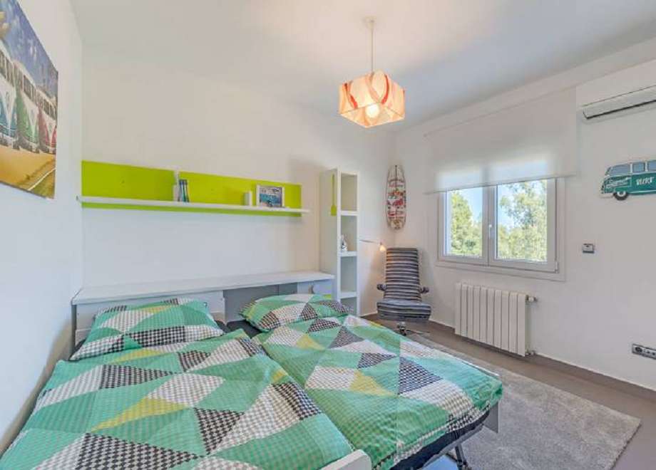 Eine Wand trennt den gemütlichen Wohnbereich mit 2 Sofas, Kamin mit Heizkassette, großem Flachbildschirm mit deutschem SAT-TV und weiten Panoramatüren von der Küche. Angrenzend ein Doppelschlafzimmer mit einem 160x200 cm massiven Bett (2 Matratzen) und Einbauschrank. Daneben ein modernes Tageslicht-Duschbad mit großer Dusche und Waschtisch sowie Toilette.Das neben der Eingangstür gelegene halboffene Treppenhaus bringt Sie in das Obergeschoss. Dort befinden sich 2 weitere großzügige und lichtdurchflutete Schlafzimmer und ein weiteres modernes Bad mit Badewanne, Doppelwaschtisch, Toilette. Das Hauptschlafzimmer mit einem 160x200cm Bett, dem geräumigen Einbauschrank sowie TV Gerät, besticht durch seine großen Panoramatüren mit Ausgang zur Dach-Terrasse mit supertollem Blick über Denia und das Meer. Das zweite Schlafzimmer verfügt über 2 Betten 190x90cm, Einbauschrank. Über das Treppenhaus gelangen Sie auch in das Untergeschoss des Hauses mit dem großen Hauswirtschaftsraum. Dort finden Sie neben der Waschmaschine auch Staubsauger, Putzgeräte, Bügeleisen und Bügelbrett sowie Spielzeug für den Pool. TV-Geräte mit SAT TV finden Sie im Wohnzimmer und in 1 Schlafzimmer. Die Fenster des ganzen Hauses sind mit elektrischen Rolläden versehen.