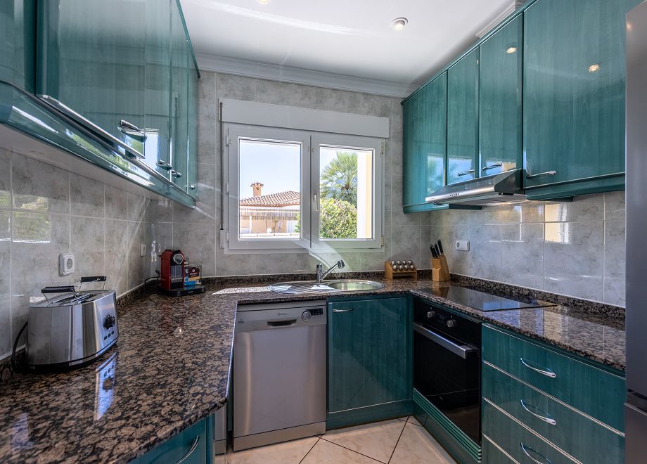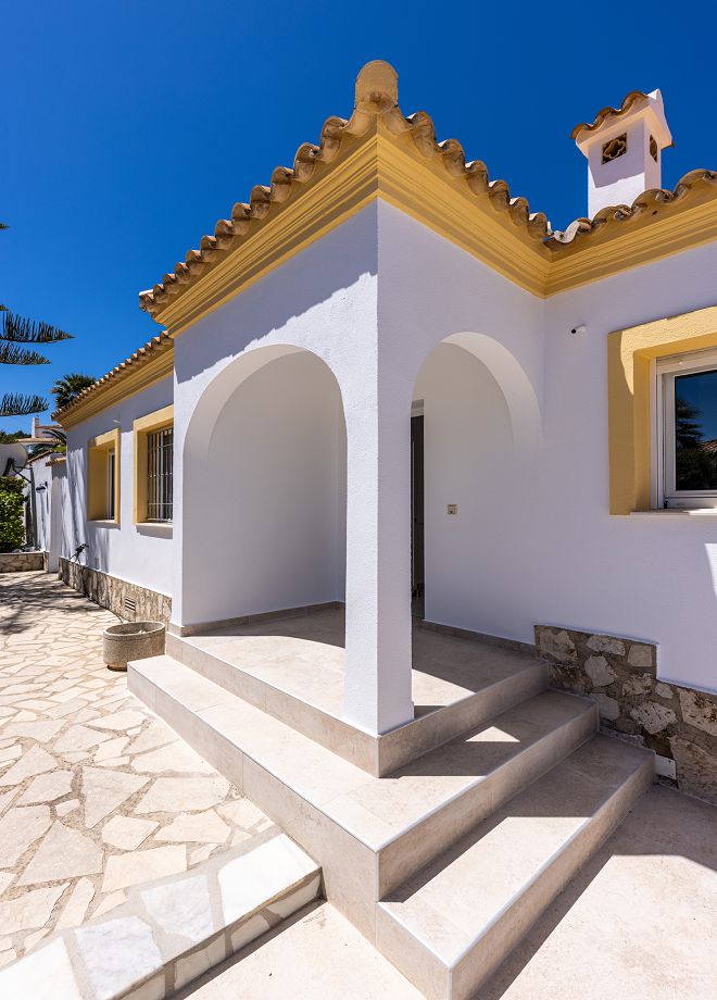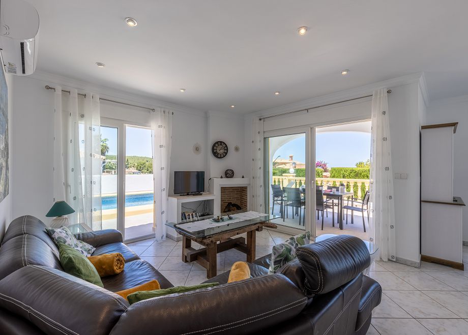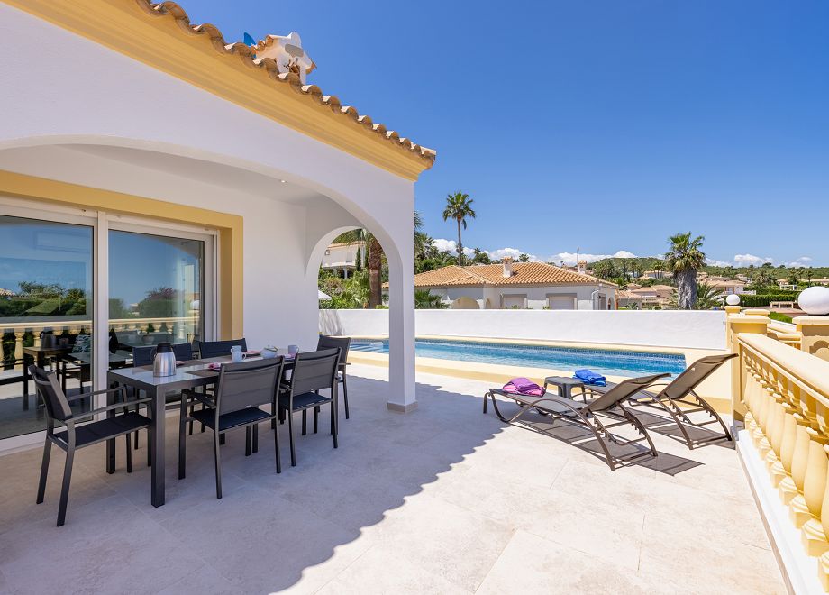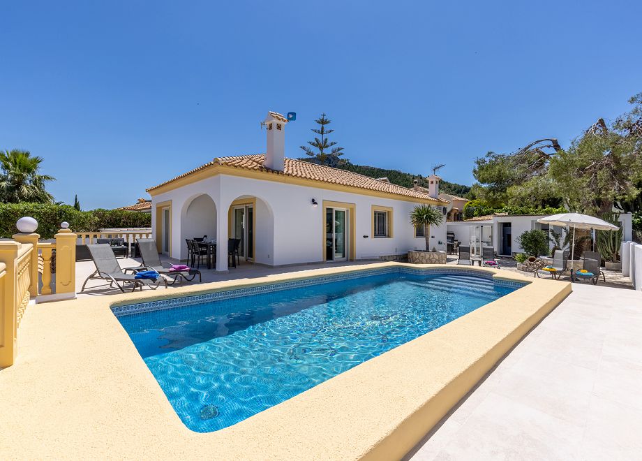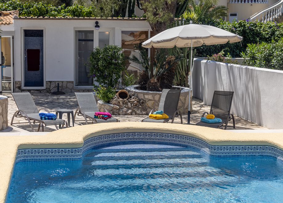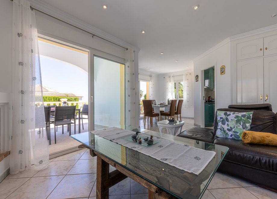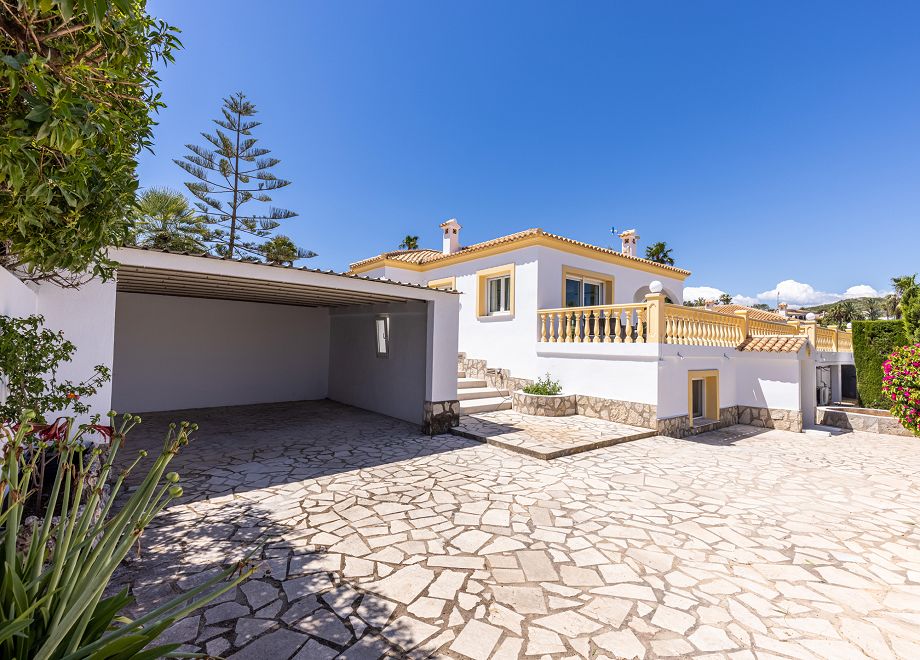 In Denia, de toegangspoort tot de Costa Blanca, ligt Villa Pitó in de wijk Marquesa 6 met een prachtig uitzicht op de Middellandse Zee. Wij bieden u een vrijstaande woning aan met een woonoppervlakte van circa 140 m² en een perceel van 800 m², 3 slaapkamers, 1 badkamer met bad en douche, 1 doucheruimte, aparte keuken, woon-eetkamer met uitzicht op zee. Via een elektrisch rolluik heeft u toegang tot twee overdekte parkeerplaatsen direct voor de woning. Vanaf daar leiden 8 treden naar de overdekte ingang. Via de hal met grote kast komt u aan de rechterkant in de ruime woon-/eetkamer en de aparte keuken. Aan de linkerkant 3 slaapkamers en 2 badkamers. De lichte woon-/eetkamer is voorzien van een comfortabele zithoek, een moderne televisie met Duitse satellietzenders, een open haard en een grote eettafel voor 6 personen. 3 grote deuren leiden naar het zwembadterras aan de voorzijde met uitzicht op zee.