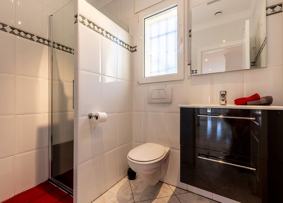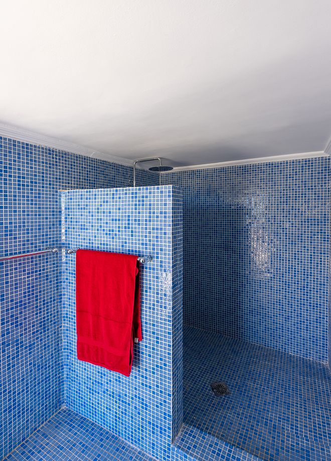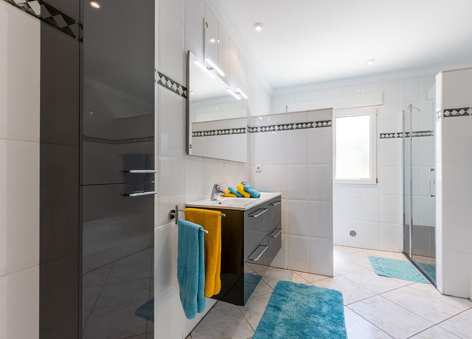 Een zeer ruime badkamer met inloopdouche, ligbad, toilet en dubbele wastafel, een kleinere badkamer met toilet, inloopdouche en wastafel. Via de woon-eetkamer bereikt u het zwembadterras met een zwembad van 5 x 10 m, een waterdiepte van 1,40 m - 1,80 m en een prachtig uitzicht op zee. Voor de woonkamer bevindt zich een overdekt terras met tafel en stoelen. Aangrenzend aan het zwembadterras ligt een terras met mediterrane planten. Vanaf daar heeft u toegang tot een apart buitensanitairgebouw met een grote douche en een apart toilet. Direct achter het huis bevindt zich nog een ruim terras met een barbecueplek, zitgelegenheid en een paviljoen met glazen voorgevel. Daar vindt u een stenen keukenblok met granieten aanrechtblad, een spoelbak, een vaatwasser en nog een grote koel-vriescombinatie. Tijdens de koudere maanden kan dit gebied tegen de wind worden beschermd door een wand van glazen schuifelementen.